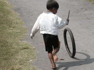 वो साइकिल के पहिए से निकले खराब टायर को छोटी सी लकड़ी का टुकड़ा लेकर दौड़ाना , और देखना चल किसकी गाड़ी आगे निकलती है ।